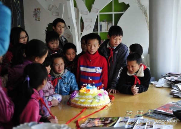 在陈建伟校长的带领下,嘉泽中心小学二十多名小朋友来到花道书吧,他们都是新市民子女,看到书架上整齐的图书和各式嘉泽主题的纪念品,孩子们的脸上洋溢着好奇与兴奋,当听到书吧的主人告诉大家“如果你们有喜欢的书都可以到我们这里借阅,还有礼物送给大家”时,孩子们脸上露出会心的笑容。参观结束后,书吧播放了花博会的宣传片,“你们就是花博会的小小主人,到了2013年就作为花博会的小小志愿者迎接全国的客人和朋友,好不好”,“好!”在志愿者的鼓励下,同学们齐声大喊,并用手中的笔写出了自己的心声,“祝嘉泽越来越美!”“让嘉泽的花种到全宇宙的星球上!”孩子们用最单纯、最真诚的心表达了对第二故乡的祝福。“祝你们生日快乐”,在舒缓的音乐声中,同学们过了一个难忘的集体生日,由于父母平日忙于工作,没有时间给他们过生日,此次活动特别策划了集体生日,孩子们争相吹着蜡烛,大声的唱着生日歌,美美的吃着蛋糕,书吧里洋溢着温暖和关爱。