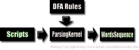 如图一所示,脚本 Scripts 进入分析内核 ParsingKernel,分析内核根据 DFA 规则作词法分析,生成单词序列