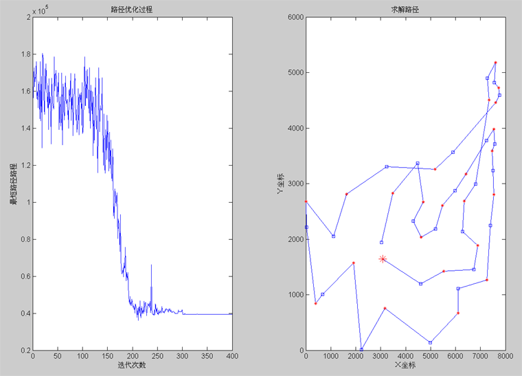 48个城市的计算结果,大的红*表示路径开始城市,途经城市依次用蓝色方块和红色*标示。